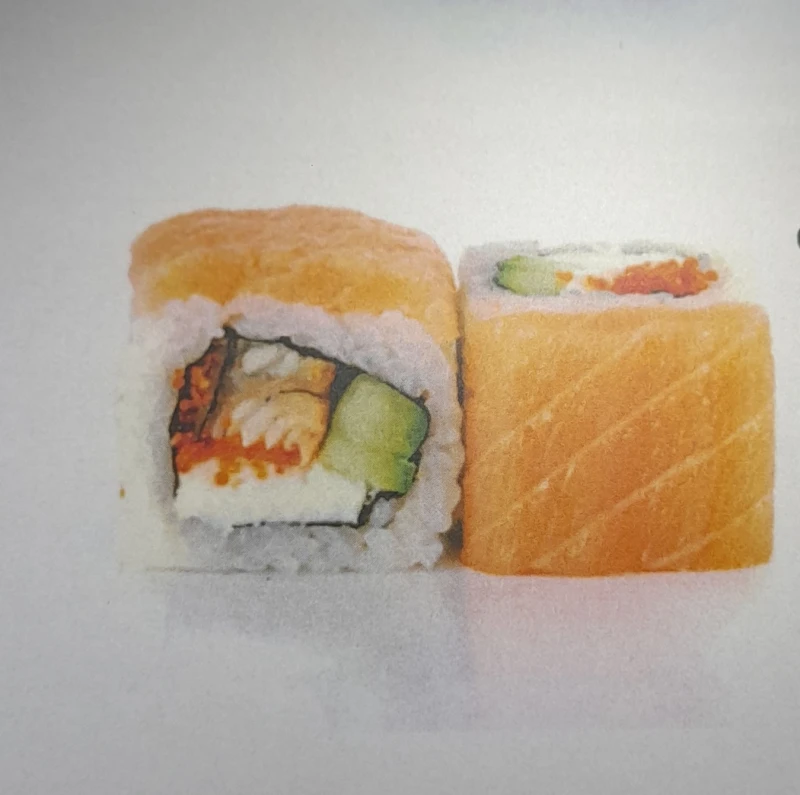 Семга слабосоленая, угорь копченый, огурец, икра масаго, сыр сливочный