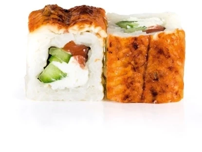 Угорь копченый, сыр сливочный, семга слабосоленая, огурец, кунжут, соус унаги