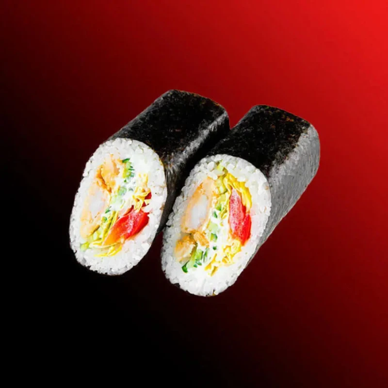 Креветка в кляре,рис,соус спайси,икра масаго,огурец,авокадо,лук зеленый,заправка медово цитрусовая. Подается с имберём ,васаби и соевым соусом