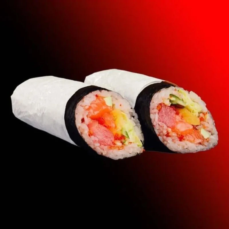 Филе тунца, рис, соус манго-чили, икра масаго, лук зеленый, огурец, авокадо, заправка медово-цитрусовая. Подается с имбирём, васаби соевым соусом.