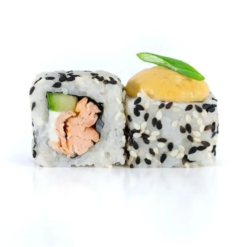 Обжаренный лосось, сыр Фета, огурец, соус «Спайси», кунжут, зеленый лук