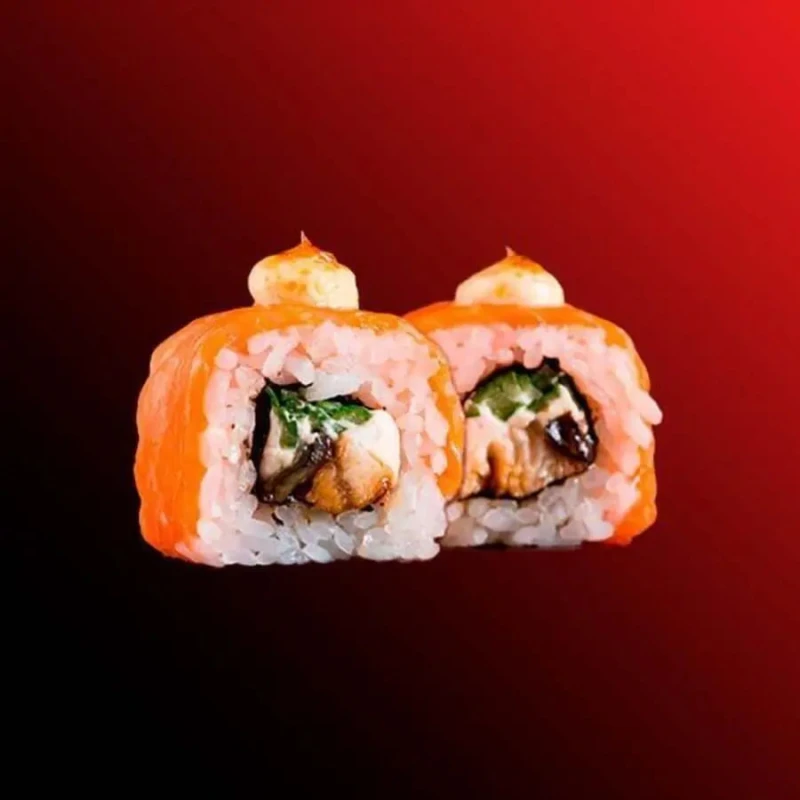 Угорь,лосось,сливочный сыр ,огурец,соус «Масаго»