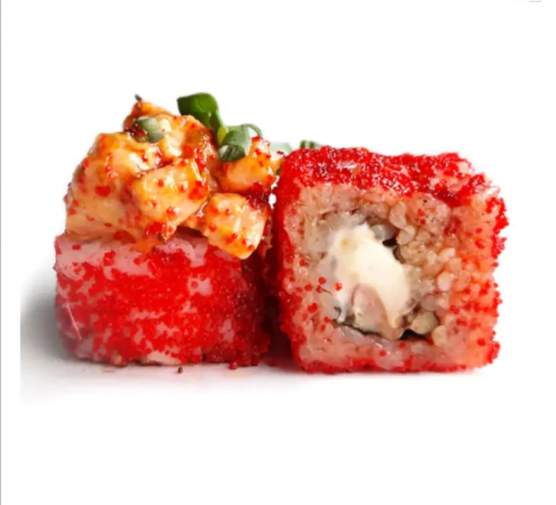 лосось, сливочный сыр, соус Спайси, омлет, икра Масаго, лук зеленый